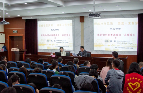 沈赤代表学校党委、行政对高红校友返校作报告表示衷心的感谢和热烈的欢迎。他指出,高红校友与学校感情深厚,是现任我校广深港校友会副会长,全面负责香港校友工作。其叔叔高月明先生为支持绍兴大学创建,曾于上世纪90年代向我校捐赠620万元,建成月明音乐楼。此次重返母校讲座,更是体现了她对母校的关心。沈赤表示,今天请高红校友为我们讲“如何在香港做义工”,是贯彻落实全国和全省高校思政工作会议的生动实践,是提高我校青年学生志愿服务意识和水平的大好机会,希望大家从高红校友身上积极汲取正能量,承担起当代大学生应尽的社会责任,成长为德才兼备、全面发展的优秀人才。
