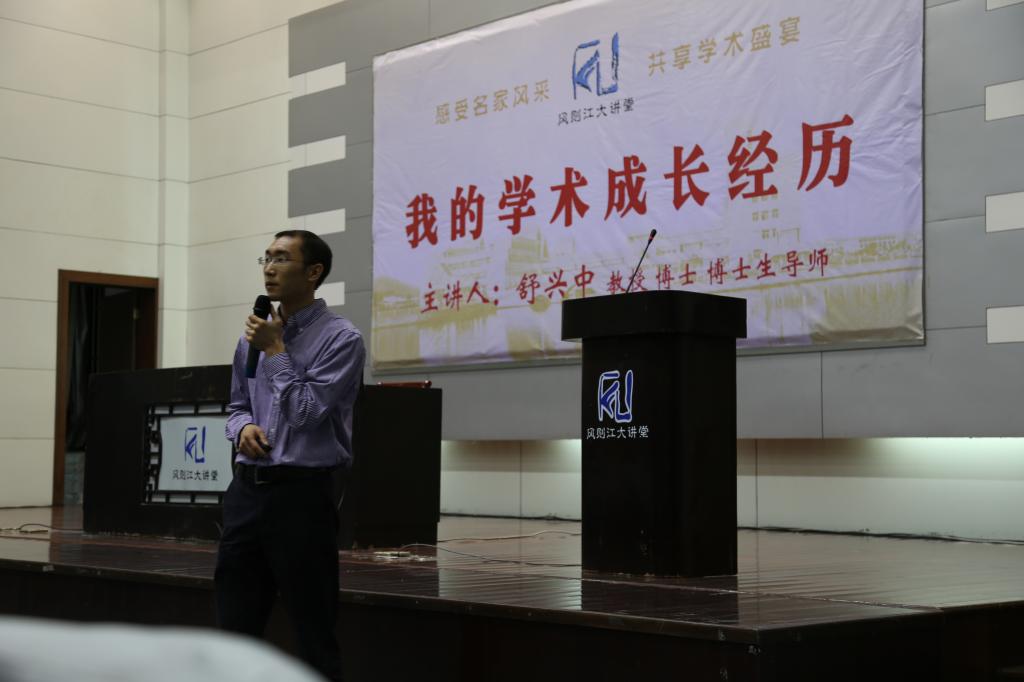 当晚,舒兴中教授应邀到学校风则江大讲堂进行讲学,其就如何做科学研究与同学们一同分享了《我的学术成长经历》。舒教授通过风趣幽默的讲解,向大家介绍了做科研一定要有目的、有恒心。只有坚持才能取得成功!讲座结束后,他同在场的同学们做了互动。最后,舒兴中教授的学业导师我院齐陈泽教授做了总结发言,他强调,在科研的道路上没有一帆风顺,唯有坚持才能取得成功!