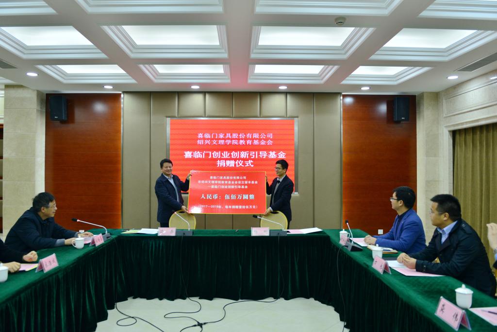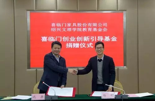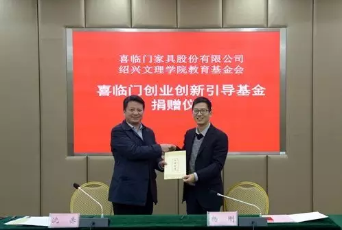 捐赠仪式上,杨刚与沈赤分别代表喜临门家具股份有限公司和我校签订捐赠协议。沈赤代表学校接受捐赠并向喜临门公司颁发捐赠证书。