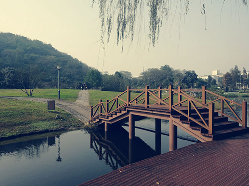 傍晚,约上三五挚友围坐在望月潭小憩,看晚霞怎样映红江水。待赤阳一点点被浸没,廊桥边绚丽的灯光便亮了起来。