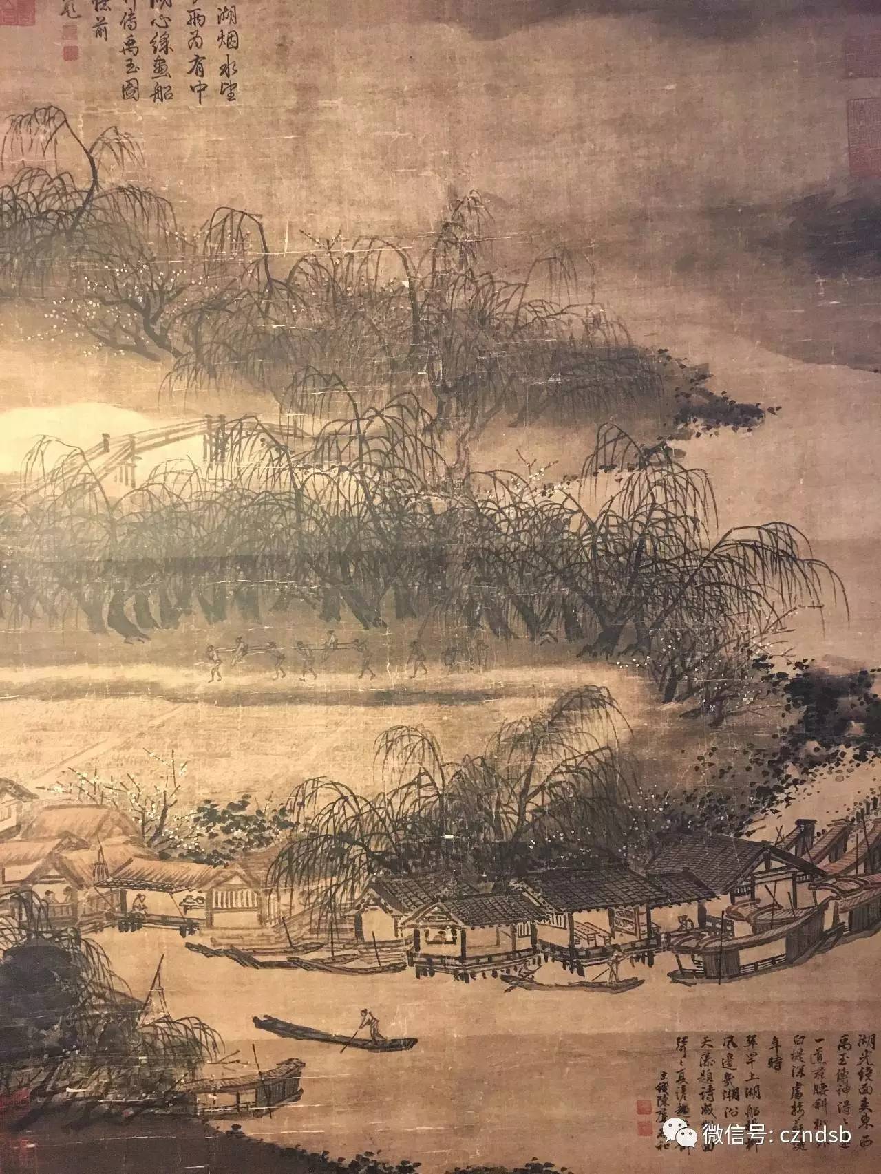 (寿老师展示的宋代画家夏圭名作《西湖柳艇图》复制品局部)