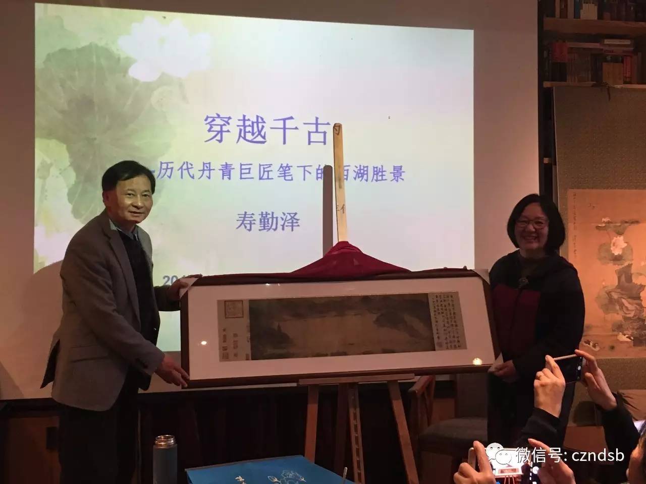 (寿勤泽老师将自己珍藏的《西湖图》复制珍品赠送给书吧女主人朱锦绣老师)
