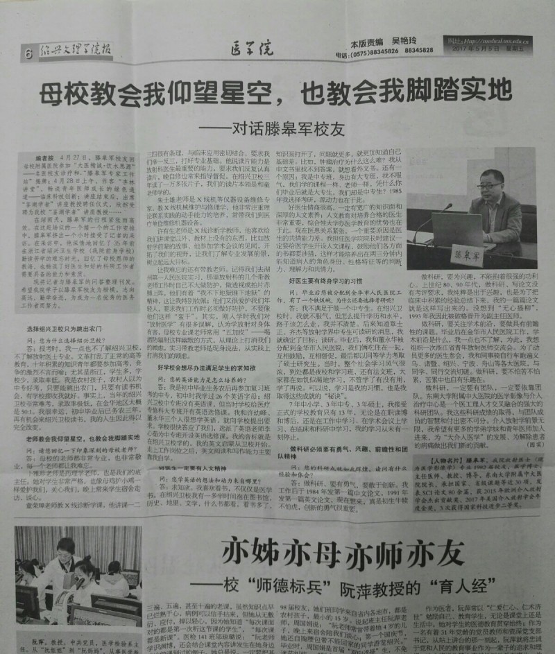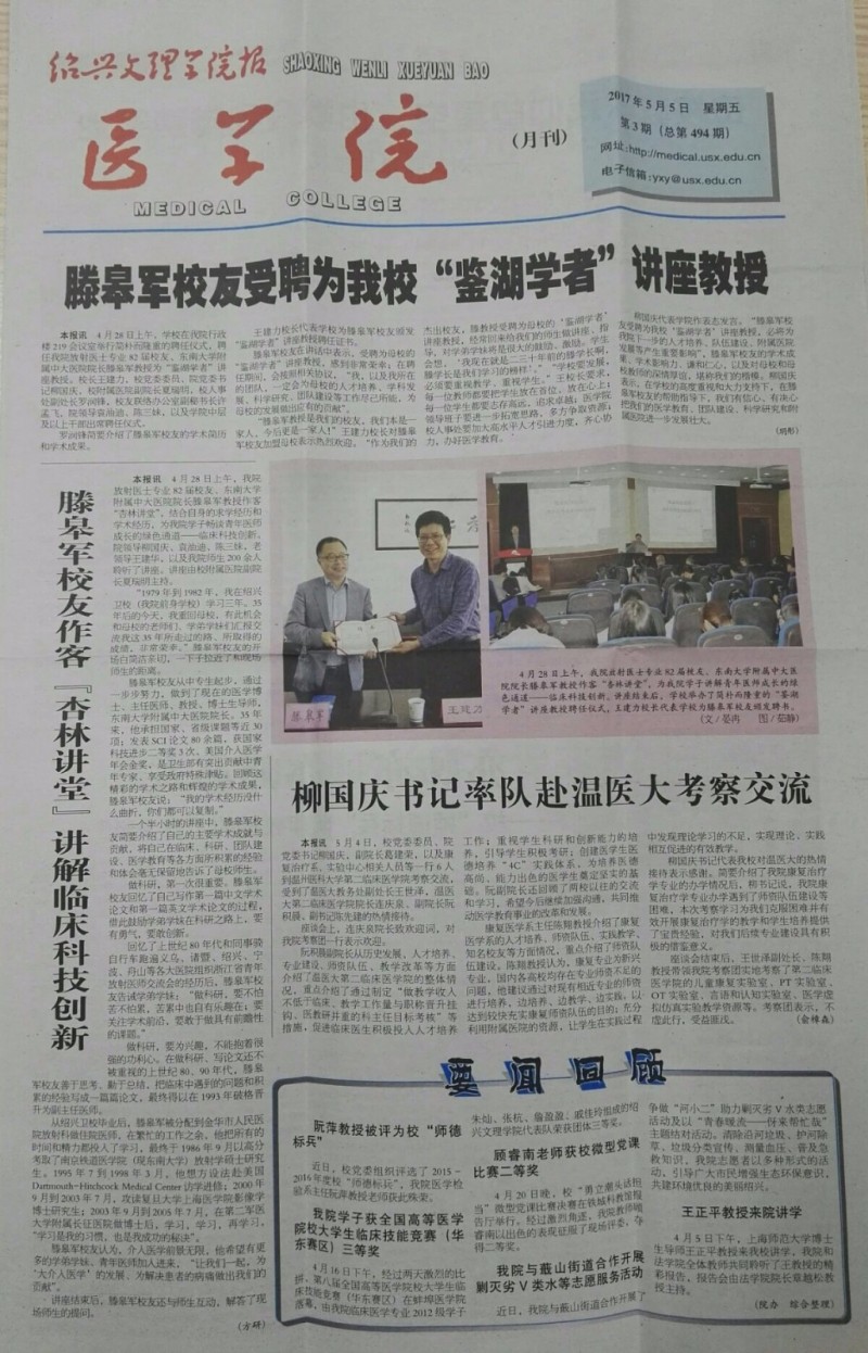 另外,时值同学会期间,我们又收到《绍兴文理学院医学院院报》,恭贺滕皋军同学被绍兴文理学院医学院聘为“鉴湖学者”讲座教授。