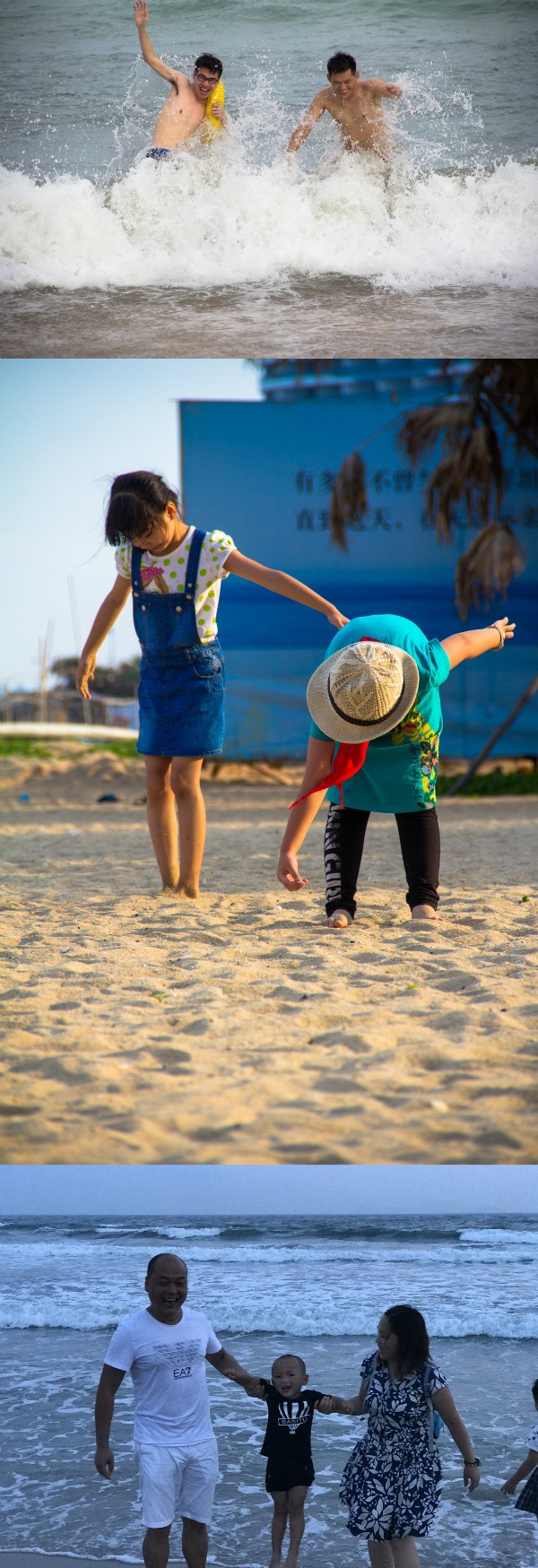 大人们追逐浪花,孩子们捡拾贝壳,亲子互动,其乐融融。