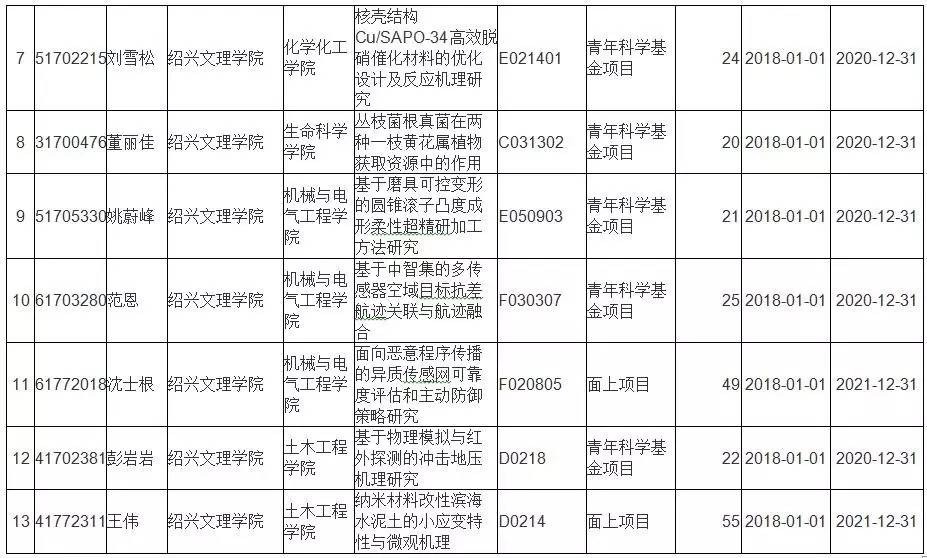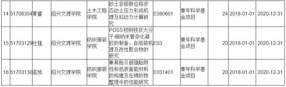 近日,2017年度国家自然科学基金项目评审结果揭晓,国家自然科学基金委发布了《关于公布2017年度国家自然科学基金申请项目评审结果的通告》[国科金发计〔2017〕98号],绍兴文理学院共获批主持16项,其中面上项目5项、青年科学基金项目11项,资助直接费用总额524万元。学院分布情况如下:数理信息学院2项、化学化工学院5项、生命科学学院1项、机械与电气工程学院3项、土木工程学院3项、纺织服装学院2项。具体项目如下: