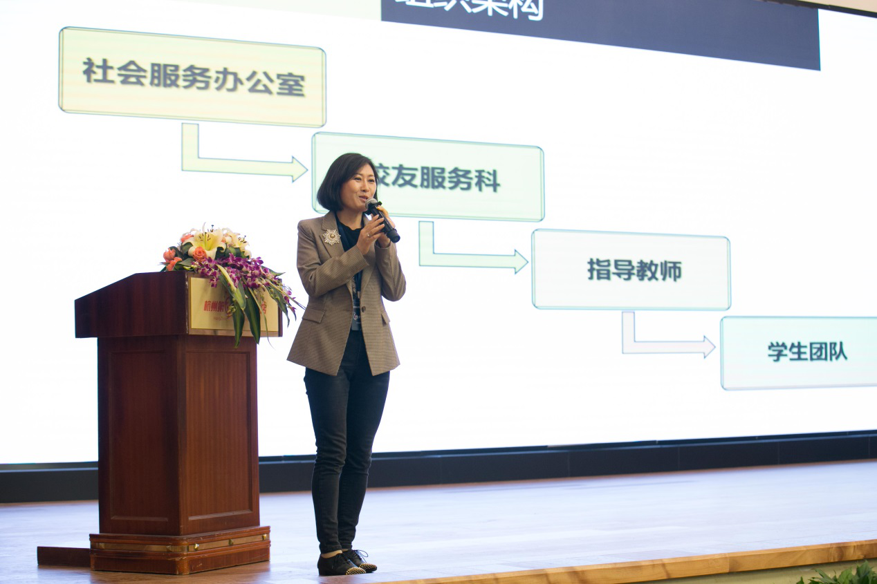 中国传媒大学社会服务办公室副主任徐红梅老师对其校友服务中心的情况做了介绍:建立由校友会部门主管的学生团队,通过细化和严格执行工作制度,完善成长与激励机制,完成了搭建校友交流平台、开展品牌活动的发展目标。