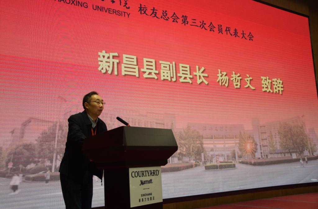 1月20日上午,绍兴文理学院校友总会第三次会员代表大会暨2018年各校友会会长、秘书长会议在新昌隆重召开,绍兴市教育局、新昌县人民政府、学校主要党政班子,各校友会会长、秘书长以及相关校友代表九十余人参加了会议。绍兴市教育局副局长马成永,新昌县人民政府副县长杨哲文校友分别为大会召开致辞。