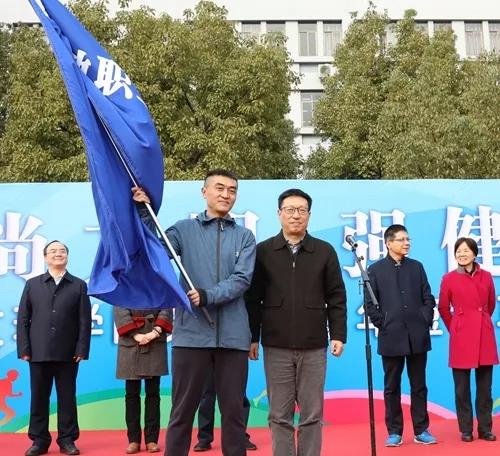 校党委书记汪俊昌为校教职工长跑协会授旗。