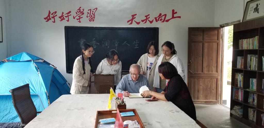 当天下午,在陈可英校友的陪同下,陈祖楠一行参观了陈可英公益事业下五洩镇中心学校“公益驿站”、马剑镇一户困境儿童家庭、侯门山乡村图书馆。陈祖楠向图书馆赠送《谈基础道德与基础修养》,并对陈可英忘我付出、心中有他人的大爱行为赞不绝口,返程前,在留言本上写下“热爱教育、热爱学生”。