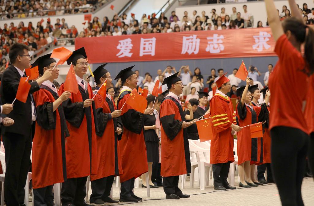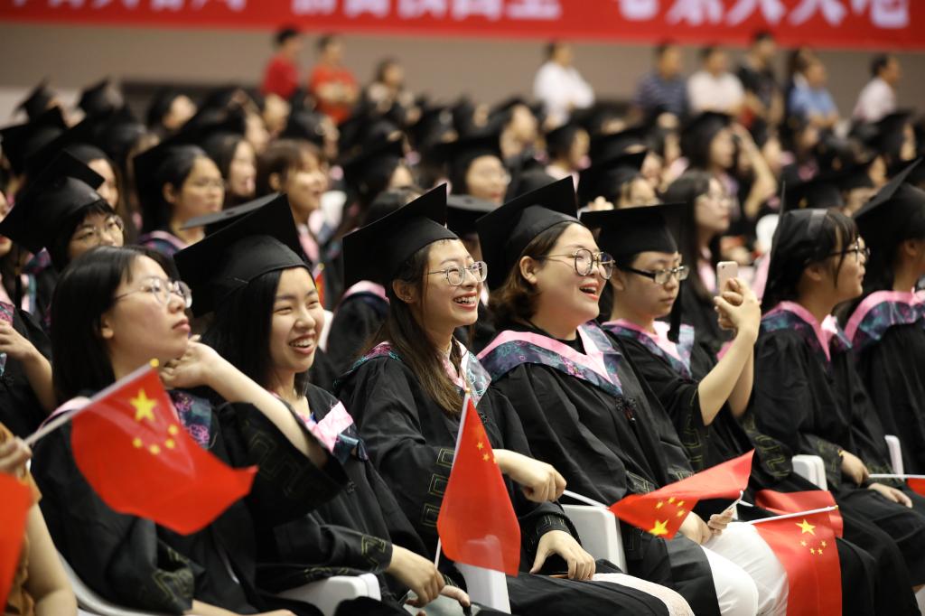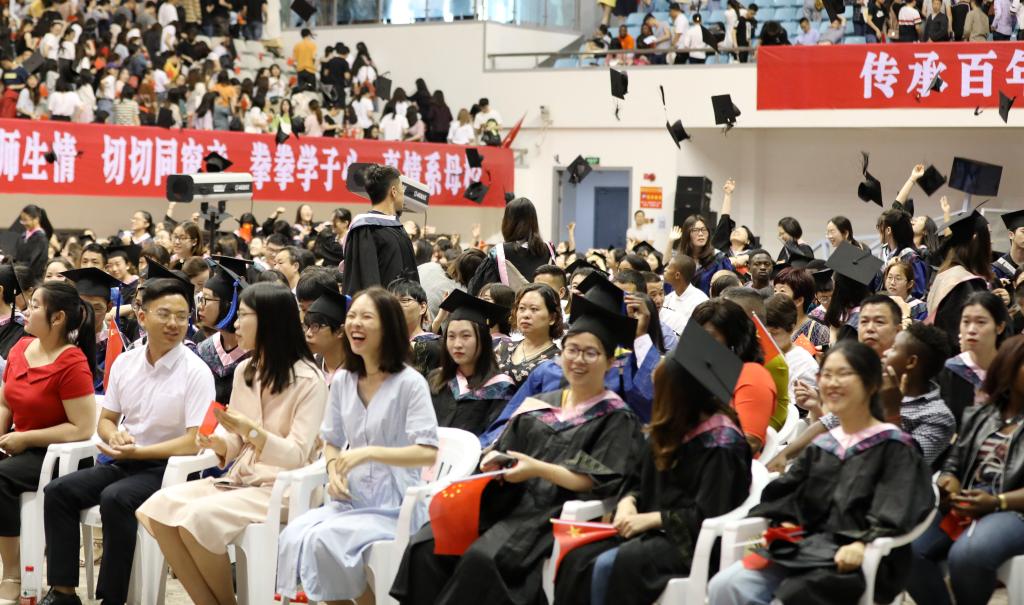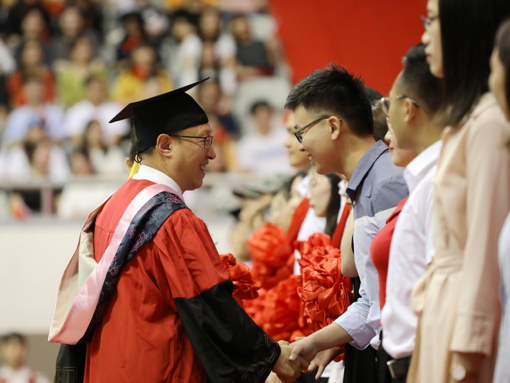 此前,6月11日、12日,河西体育馆内,校长王建力身着导师服,和2019届毕业生一一握手,祝福他们学业有成,为他们拨穗。把“穗”从右边拨到左边只需要两秒,但这是同学们通过四年努力学有所成,可以展翅高飞的标志。
