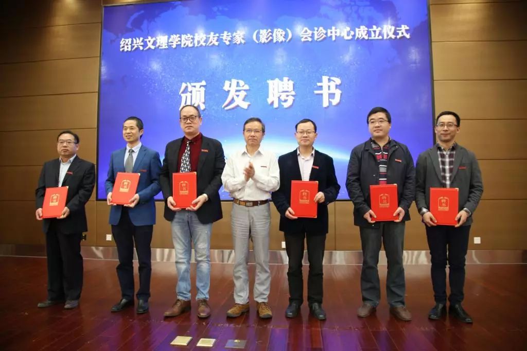 揭牌成立仪式上,医学院党委副书记金坚强宣读《关于成立绍兴文理学院校友专家(影像)会诊中心的通知》。宣绍龙、杨大明、阮伯金、校附属医院院长、医学院副院长张伟阳、绍兴市医学会放射学分会前任主任委员、绍兴市医师协会放射医师分会前任会长王伯胤、医学院党委书记夏瑞明共同为绍兴文理学院校友专家(影像)会诊中心揭牌。杨大明、校附属医院副院长徐志松和傅永平分别为会诊中心领导和专家颁发聘书。