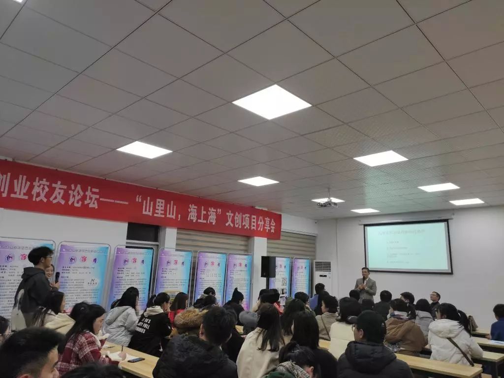 12月5日晚,由校友总会和创业学院共同举办的创新创业校友论坛在河东创业服务大厅举行。本次论坛邀请了我校纺织工程09届校友叶科、潘海荣共同分享了主题为“山里山、海上海”的文创项目。校友总会、创业学院、纺织服装学院部分老师,相关校友和在校创业学生代表聆听了讲座。