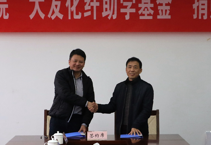 12月13日下午,“大发化纤助学基金”捐赠仪式在行政楼五楼会议室举行。宁波大发化纤有限公司副总经理、数学80届钱军校友与校党委副书记沈赤签订捐赠协议。沈赤接受捐赠并向钱军校友颁发捐赠证书。钱军校友代表宁波大发化纤有限公司向学校基金会捐赠30万元设立“大发化纤助学基金”。校友总会会长宋培基,对外联络处、学工部、化学化工学院负责人和师生代表参加捐赠仪式。