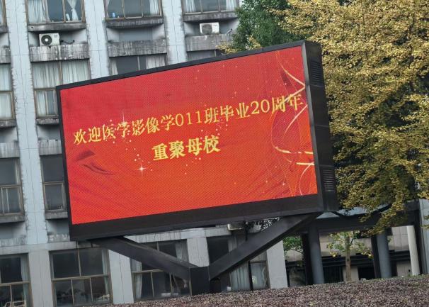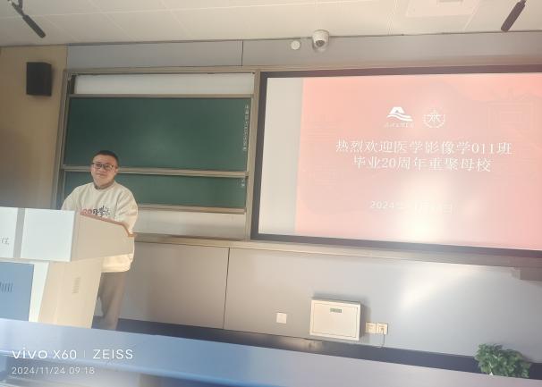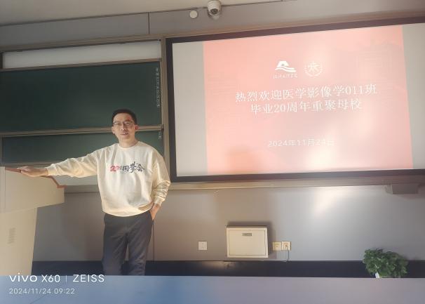 年少时光,如诗如画,有太多美好的青春回忆留在母校。24号早上同学们返校在医学院财贞楼305教室再上一堂特别的课。医学院门口的大电子屏上“欢迎医学影像学011班毕业20周年重聚母校”温暖着每一位久别的同学。马玉富老师特别重视20年的重逢,找出很久没穿的西服、领带和皮鞋,盛装出席,认真地为大家再讲一堂特殊的课,明年他也要退休了。重温课堂,大家都感触良多,课堂上每个同学都做了发言,分享了他们大学时代的回忆,分享了属于自己的成长和幸福,表达了各自心情,并对未来的展望进行了阐述。