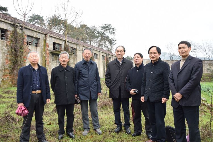 405男寝室在旧址地合影留念。从左至右依次为:周建保、尹天祥、徐一中、吴先宁、许绍勇、王谦、沈建乐。(董秋成因事未到)