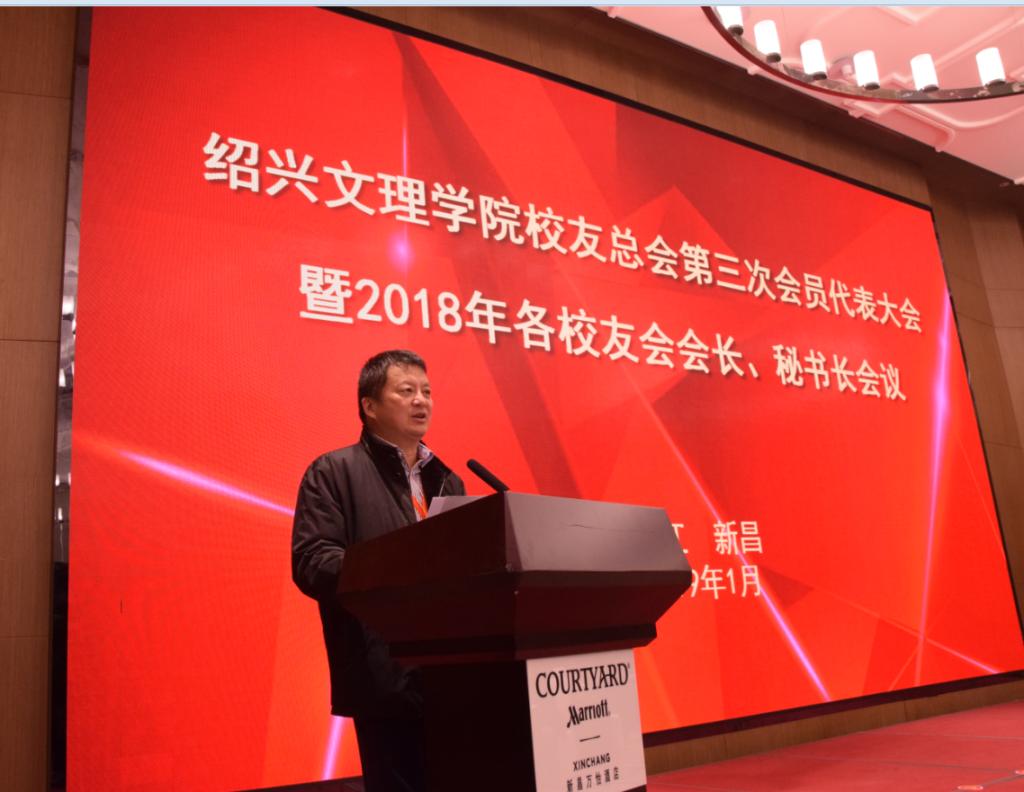 1月20日上午,绍兴文理学院校友总会第三次会员代表大会暨2018年各校友会会长、秘书长会议在新昌隆重召开,绍兴市教育局、新昌县人民政府、学校主要党政班子,各校友会会长、秘书长以及相关校友代表九十余人参加了会议。绍兴市教育局副局长马成永,新昌县人民政府副县长杨哲文校友分别为大会召开致辞。