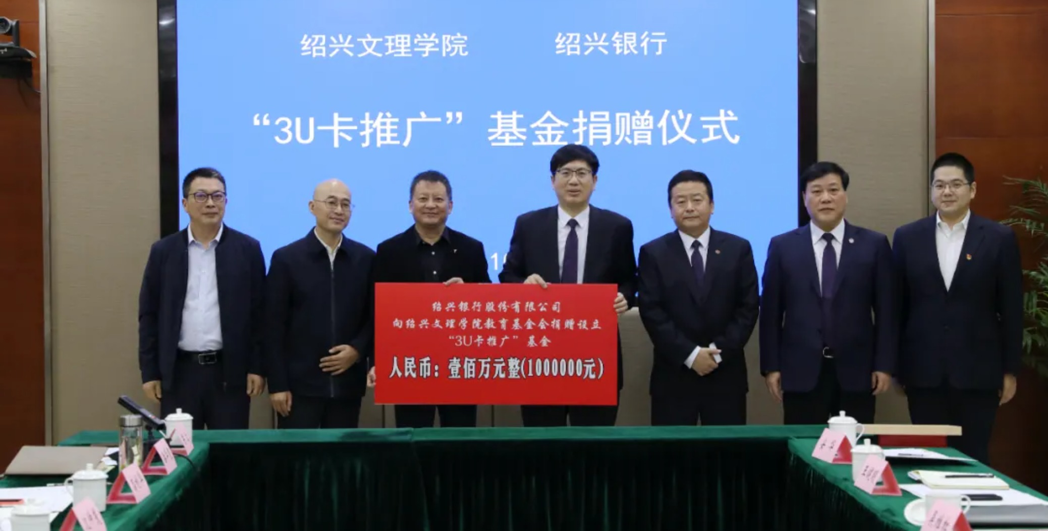 10月26日上午,校“3U卡推广”基金捐赠仪式在铁成科教馆一楼小会议室举行。校党委副书记沈赤,绍兴银行董事长金建康、行长陈军、副行长吴维杠,绍兴文旅集团游客中心主任沈仲茂,学校对外联络处、党委宣传部、教务处、计财处、后勤管理处和人文学院相关负责人等参加会议。沈赤代表学校对绍兴银行的慷慨捐赠表示感谢。他指出,在校学生和校友是人才,也是新市民,以“3U”卡为载体,开展“研学绍兴”活动意义重大,可以让学子爱上绍兴、宣传绍兴、推广绍兴,进一步扩大绍兴社会文化发展“朋友圈”。他提出,学校作为管理和使用单位,一定要管