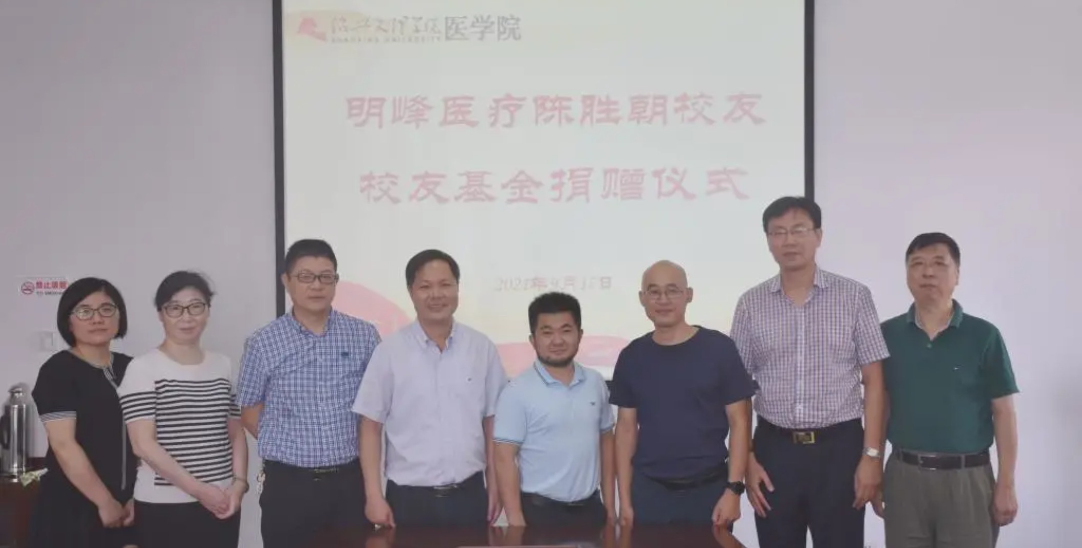 9月16日上午,“医学院校友基金”捐赠仪式在学院行政楼219会议室举行,学校校友办主任、校友总会秘书长陈立,2002届影诊专业校友、医学院校友分会副秘书长、浙江明峰医疗设备有限公司总经理陈胜朝,院党委书记夏瑞明,常务副院长葛建荣,副院长张剑、陈三妹,学院办公室及校友办公室相关负责人参加捐赠仪式。陈胜朝校友为学院“医学院校友基金”一次性捐赠叁万元,专项用于医学院校友会相关活动和工作。陈立和夏瑞明代表校友会接受捐赠并向陈胜朝校友颁发捐赠证书。陈立对陈胜朝校友的捐赠表示感谢。他指出,校友是母校的宝贵资源,是推进