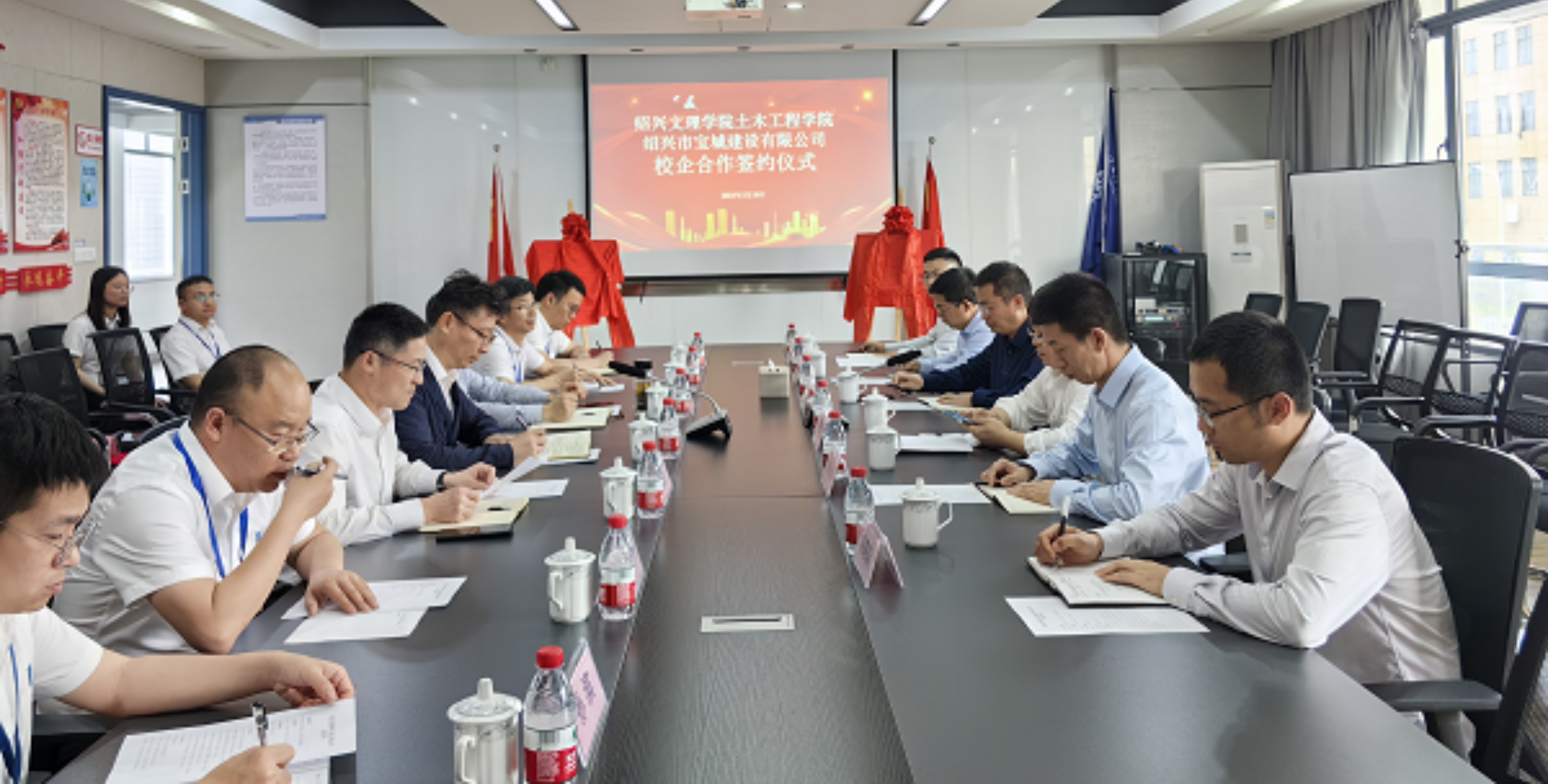 5月10日下午,绍兴文理学院土木工程学院-绍兴市宝城建设有限公司战略合作会议在绍兴宝城建筑工业化制造有限公司会议室举行。副校长胡云进,市城投集团党委委员、副总经理吕保荣和宝城建设有限公司董事长丁东初出席签约仪式。胡云进对双方战略合作协议的签订表示祝贺,他介绍了校企合作的新背景新机遇,表示希望通过紧密的战略合作,依托研究生联合培养基地和博士创新工作站等重要平台,实现共创双赢的良好局面。丁东初对绍兴文理学院一行表示热烈欢迎,他详细介绍了公司主营业务和发展现状,期待通过校企战略合作推动企业高质量发展,并表示将为