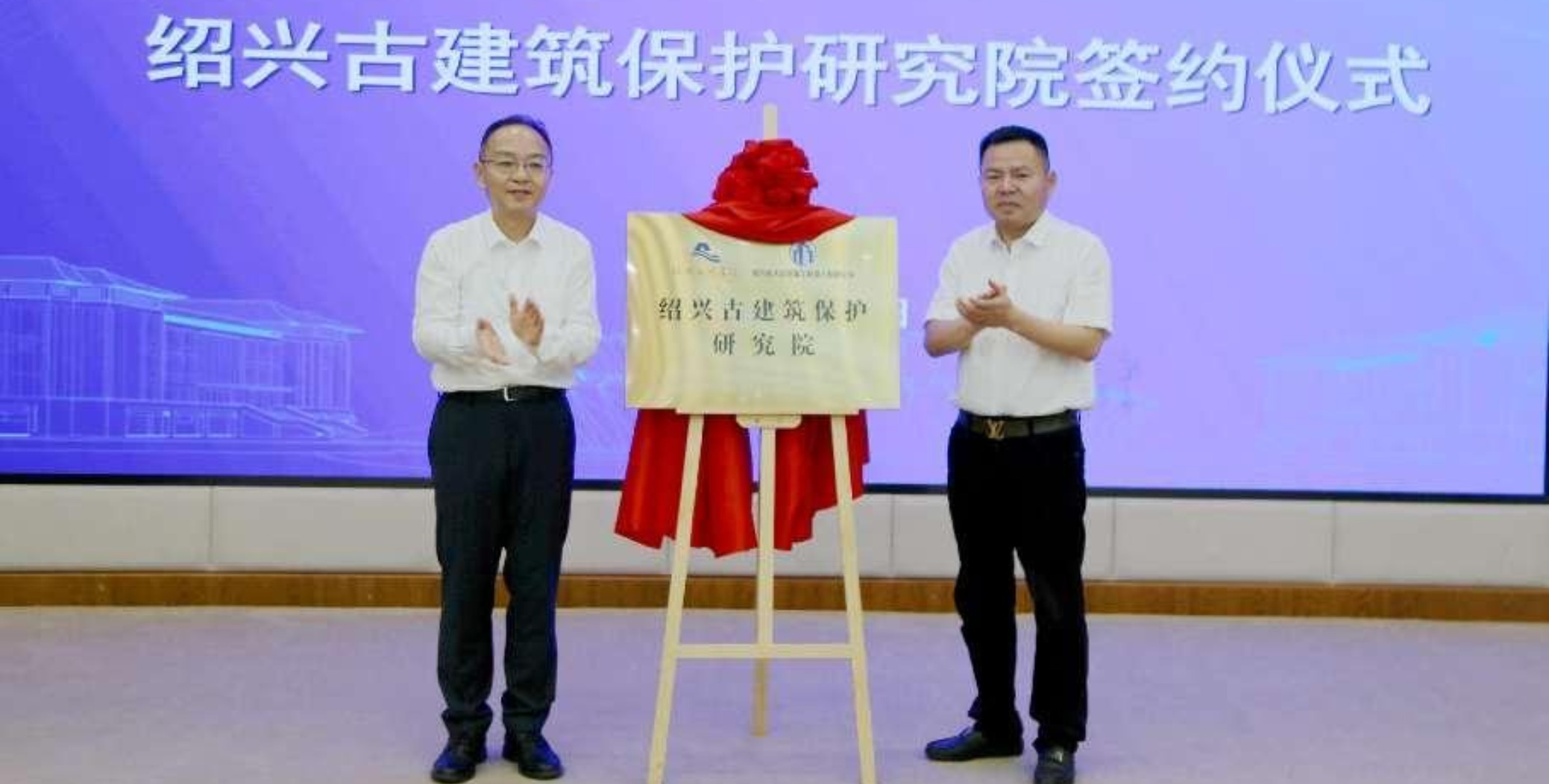 6月13日下午,绍兴文理学院与绍兴绍大古建筑工程设计有限公司在绍兴文理学院图书馆报告厅举行签约仪式,正式成立绍兴古建筑保护研究院。校长赵阳,副校长陈均土、胡云进,绍兴绍大古建筑工程设计有限公司总经理周建峰出席仪式。赵阳与周建峰为绍兴古建筑保护研究院揭牌。赵阳为研究院特邀专家颁发聘书,为“贺一烽·绍兴古建筑科技服务队”授旗。周建峰表示,绍兴是一座历史悠久的历史文化名城,拥有丰富的古建筑遗产,保护和传承这些文化遗产十分重要并有意义,他展望了双方合作的方向,包括智能监测、精细化维护、古代营造工艺研究、数字化保护