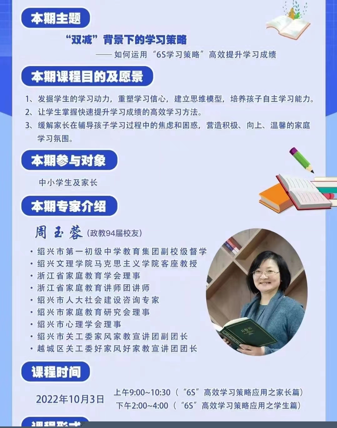 家庭教育公益课堂|周玉蓉校友:“双减”背景下的学习策略——如何利用“65学习策略”高效提升学习成绩