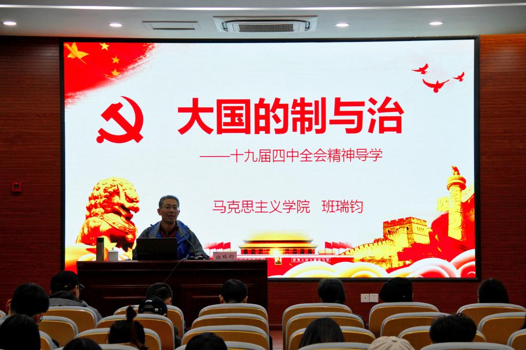 11月26日晚,原内蒙古科技大学马克思主义学院副院长、教授、硕士生导师,现我校马克思主义学院教授班瑞钧做客“时政大课堂”,作题为《大国的制与治——十九届四中全会精神导学》专题讲座。马克思主义学院、化学