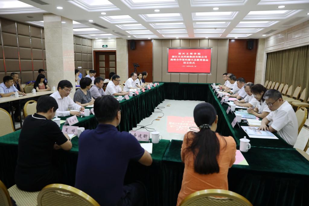 7月2日,我校与浙江天圣控股集团有限公司战略合作签约暨天圣教育基金设立仪式在铁城科教馆一楼会议室举行。天圣集团董事长孙永根、常务副总经理金国庆,校党委书记汪俊昌,校长王建力,党委副书记沈赤,副校长张宏