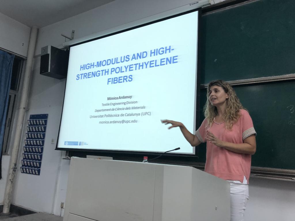 西班牙加泰罗尼亚理工大学纺织专业负责人Monica Ardanuy教授近日来我校访问。Monica Ardanuy教授为我校纺织服装学院纺工17级学生讲授了《高技术纤维》课程。授课之余,Monica