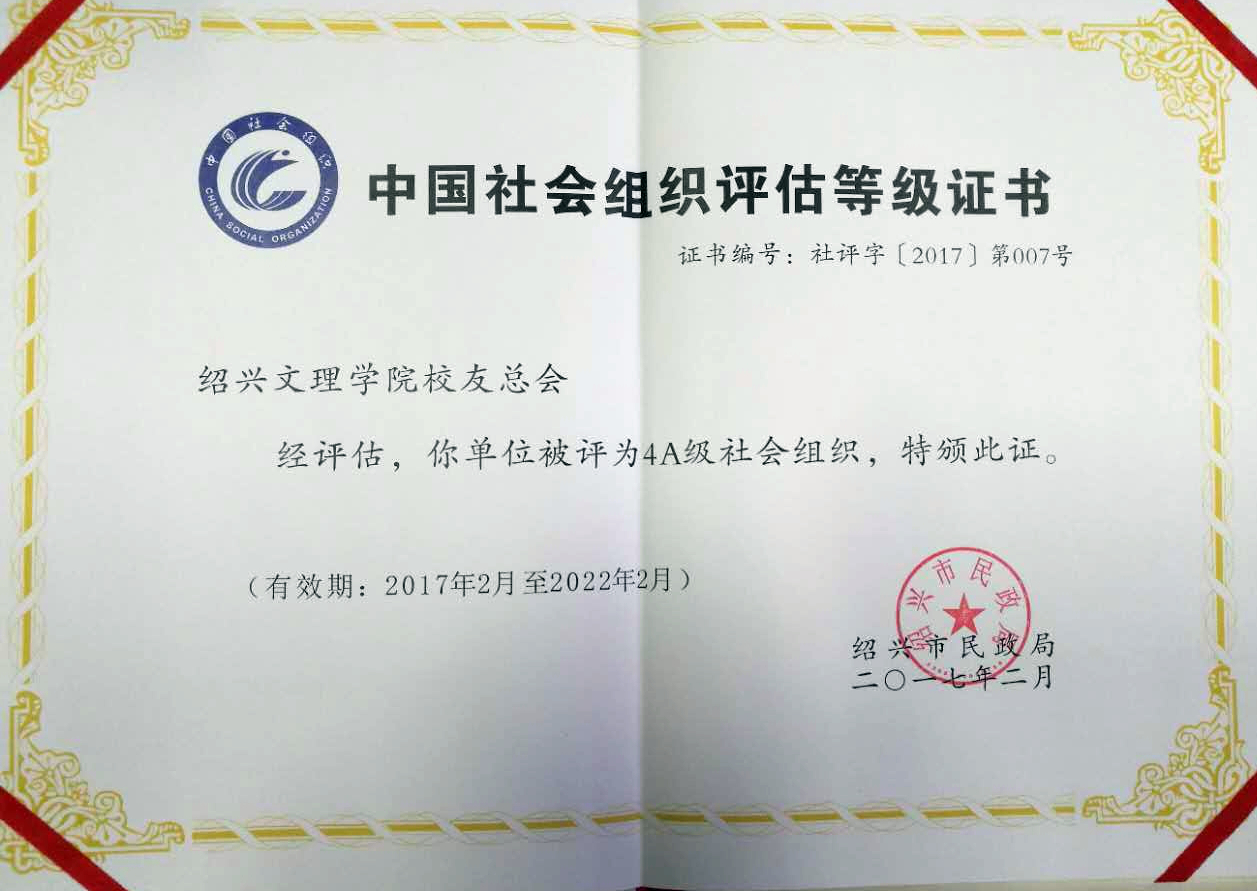 近日,根据民政部《社会组织评估管理办法》,经第三方评估机构初评,绍兴市社会组织评估委员会审核,确定了绍兴市16家单位获得3A级及以上评估等级社会组织,其中,我校校友总会荣获社会组织评估4A级单位。