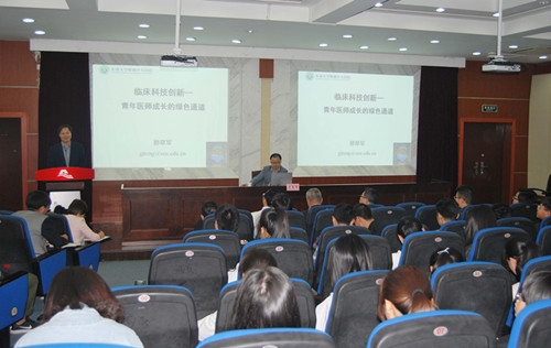 4月28日上午,我校放射专业82届校友、东南大学附属中大医院院长滕皋军教授作客“杏林讲堂”,结合自身的求学经历和学术经历,为我校医学生讲解青年医师成长的绿色通道——临床科技创新。校党委委员、医学院党委