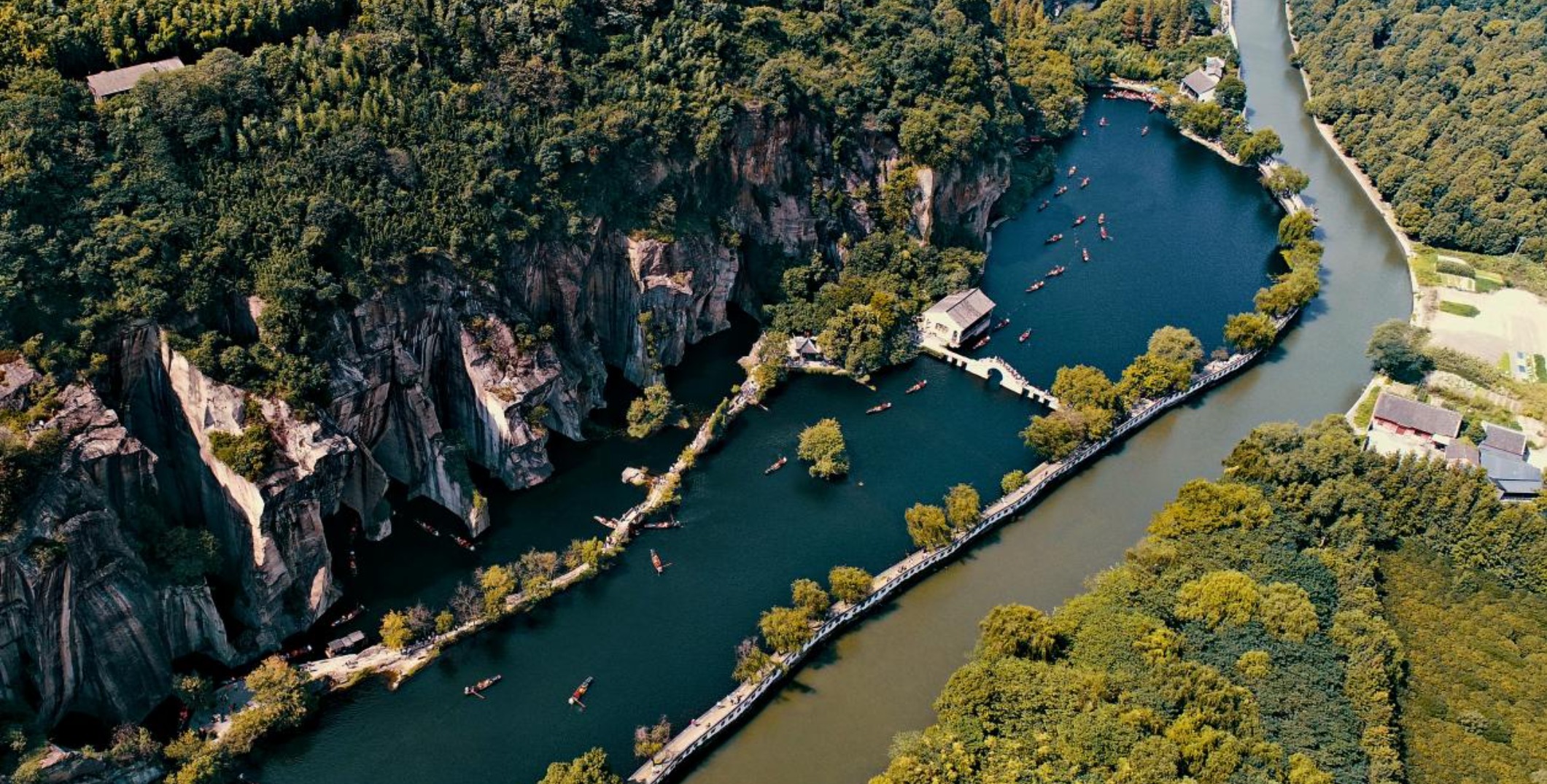 东湖,位于绍兴城东5公里处,原为一座青石山,自汉代起石工相继至此凿山取石,经过千百年的凿穿斧削,遂成悬崖峭壁,奇潭深渊。清光绪二十二年(1896年),陶渊明第45代孙,晚清著名书法家、教育家、园林艺术家——陶濬宣耗资8000银元购得此地,以《桃花源记》为范本,精心布局园内的亭、台、楼、阁,与崖壁、岩洞、石桥、湖面巧妙结合,历时三年细致打磨,于1899年建成了美妙绝伦的东湖。东湖因山而生,因石而奇,因水而美。湖中崖壁千寻,有的对峙如门,有的倒悬若堕,有的深曲如洞,水色深黛、清凉幽静,